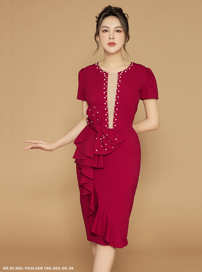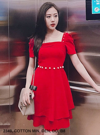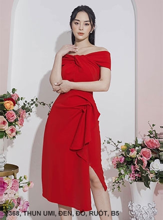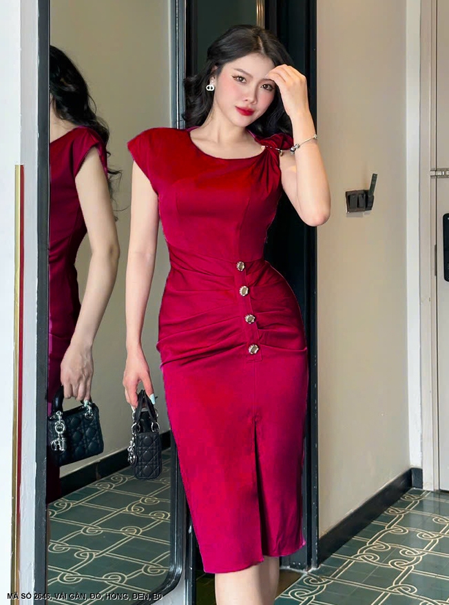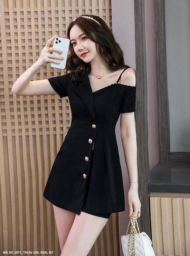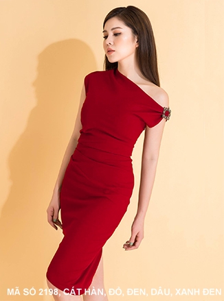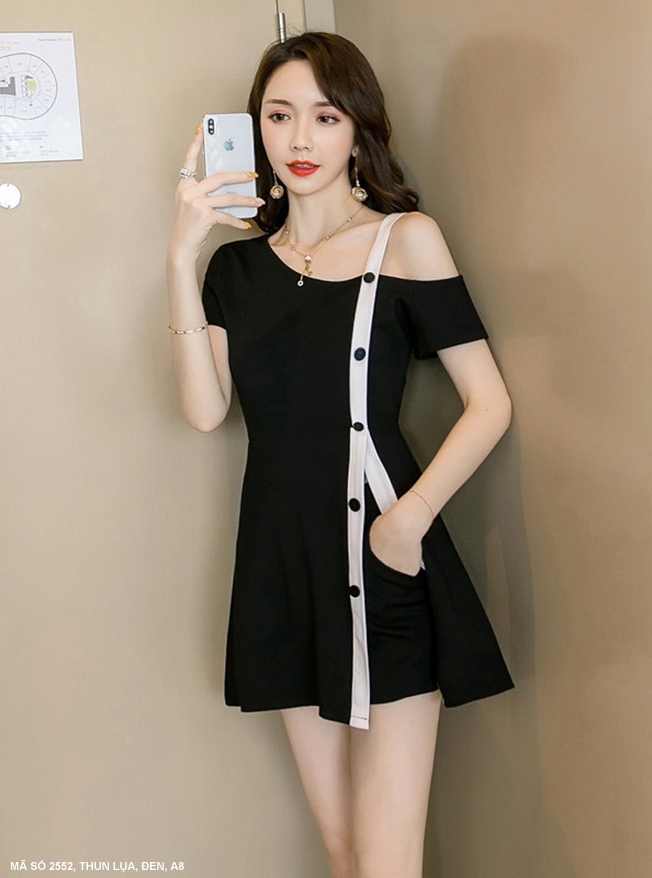 ĐẦM ÔM VAI CHÉO ĐÍNH 4 NÚT EO