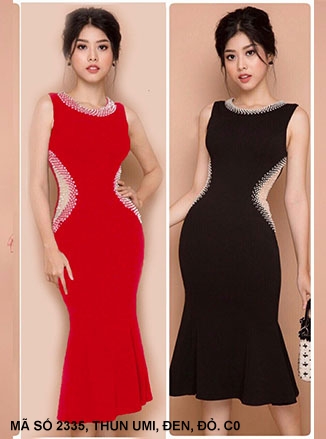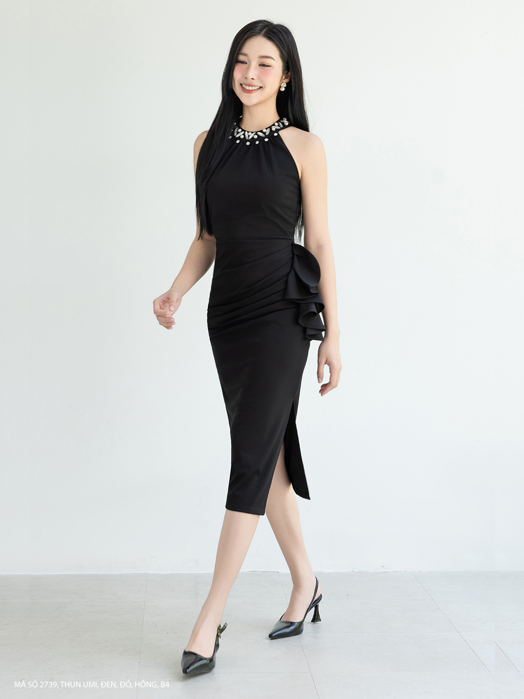 ĐẦM ÔM CỔ THUYỀN SÁT NÁCH ĐÍNH HOA EO