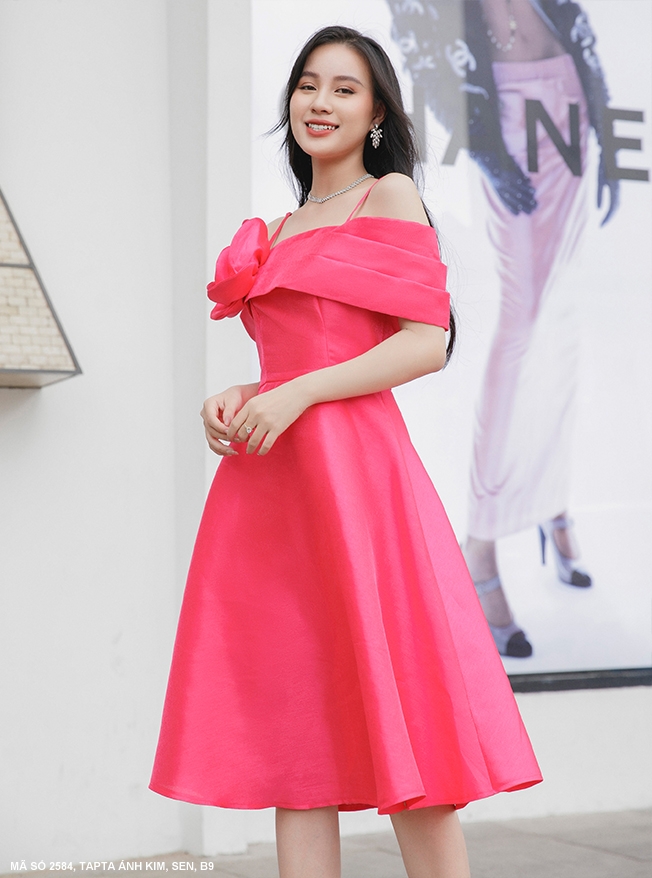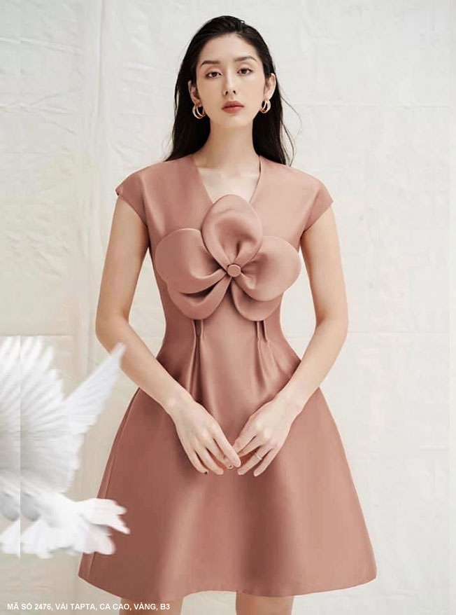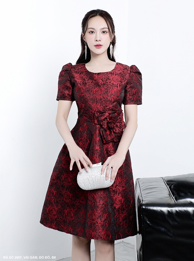 ĐẦM XÒE VẢI GẤM EO ĐÍNH HOA HỒNG