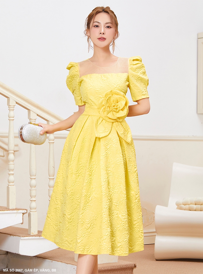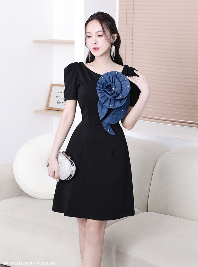 ĐẦM TAY NGẮN EO ĐÍNH BÔNG LỚN MAY CHỈ NỔI SANG TRỌNG