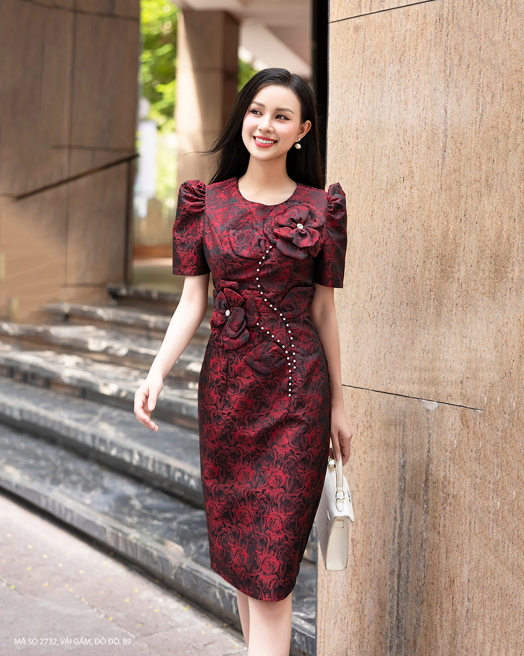 ĐẦM XÒE 1 DÂY MỘT BÊN VAI ĐÍNH HOA HỒNG